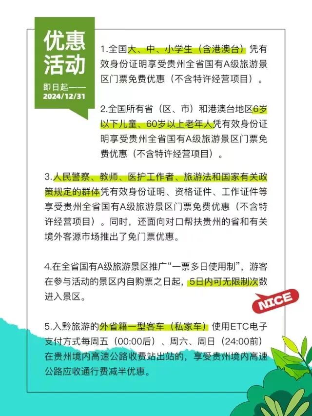 优惠内容:生肖属龙的“各省(自治区,直辖市)居民,港澳台同胞及海外华人华侨”入黔旅游,凭有效身份证件可享受贵州全省国有A级景区免门票优惠(不含特许经营项目)。