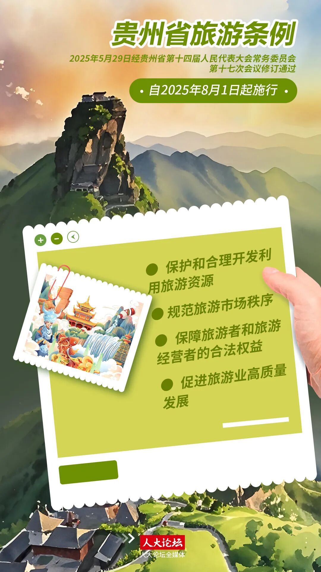 省人大常委会深入贯彻落实习近平总书记重要讲话精神,修订通过《贵州省旅游条例》,自2025年8月1日起施行。《条例》的施行,将更好保护和合理开发利用旅游资源,规范旅游市场秩序,保障旅游者和旅游经营者的合法权益,促进全省旅游业高质量发展。
