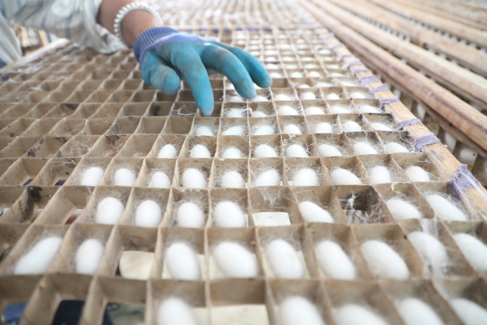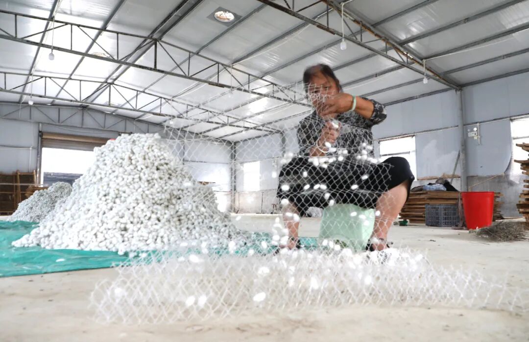 在必克村蚕房里,一排排方格簇整齐排列,大蚕均已上簇结茧,颗颗蚕茧形状饱满、雪白如霜。蚕农们一手压茧,一手接茧,无数粒春蚕结茧的“劳动成果”被快速摘下,整齐堆放,整个过程井然有序。蚕茧品质上乘,不仅为本土企业提供优质原材料,还吸引了不少外地客商前来收购。