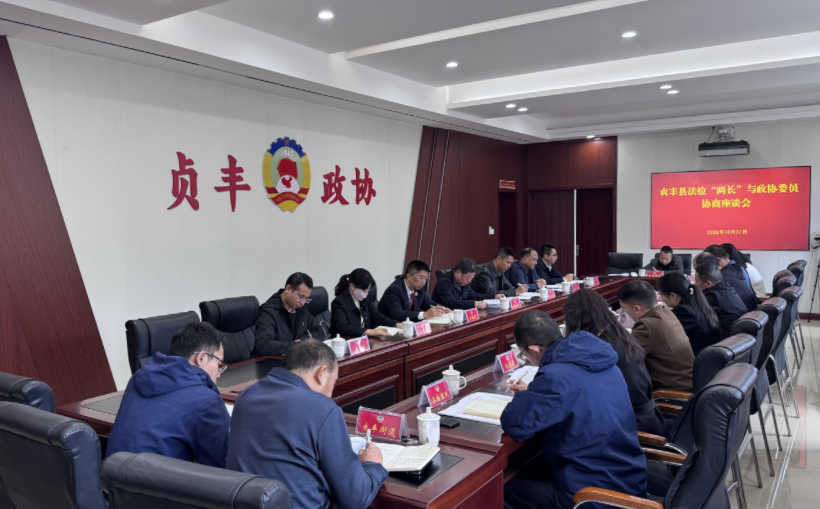 10月31日,贞丰县召开法检“两长”与政协委员座谈会。县政协主席李正渊出席,县政协副主席梁峰、孙志艳、王彦,县法院院长蒋文禄、县检察院检察长王成刚,县政协秘书长和部分政协委员参加。