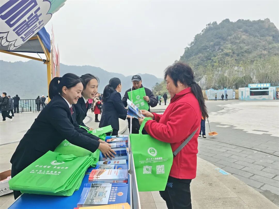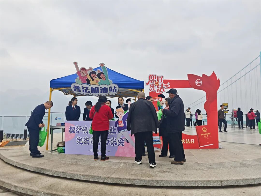 贞丰县人民检察院在花江峡谷大桥云渡服务区设置“普法加油站”和“您好宪法”打卡点,以精准检察履职筑牢旅游安全防线。活动现场,检察官向游客详细介绍检察工作站职能,聚焦旅游消费纠纷、人身损害赔偿等热点,提供“零距离”法律咨询服务。