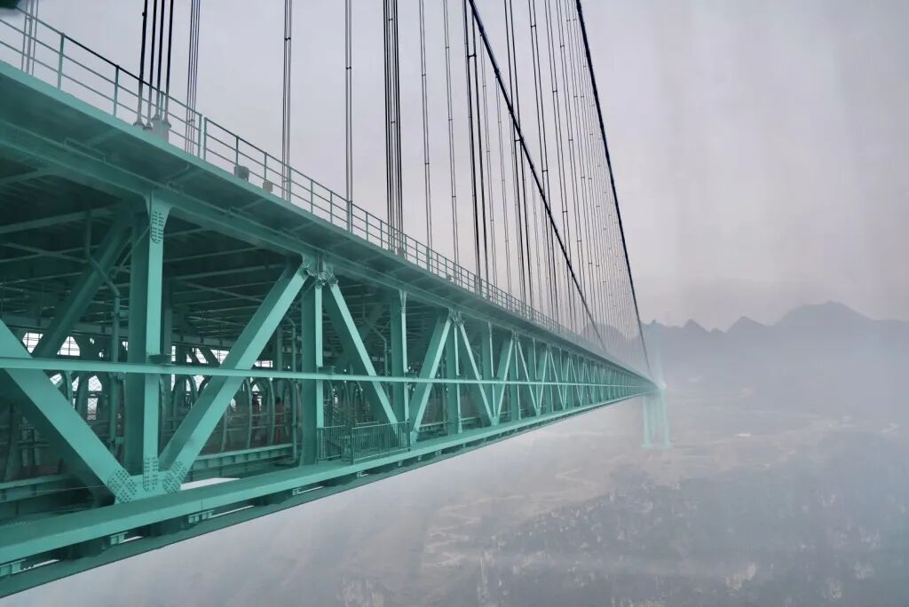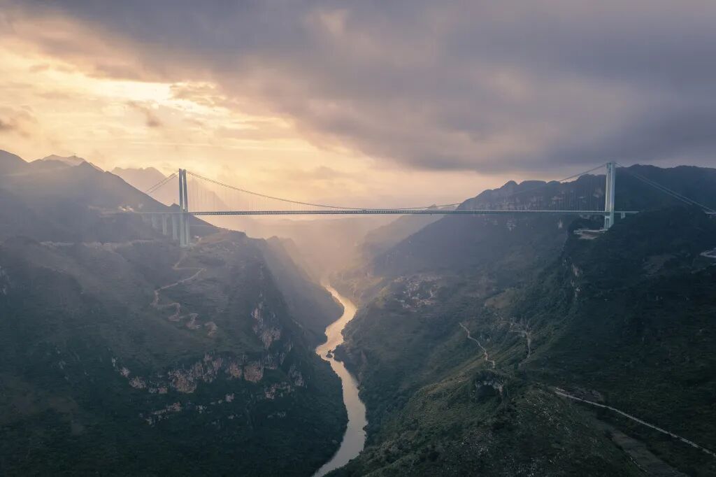 花江峡谷大桥主跨径达1420米,桥面距江面垂直高度625米,被誉为“横竖都是第一”的世界第一高桥。
