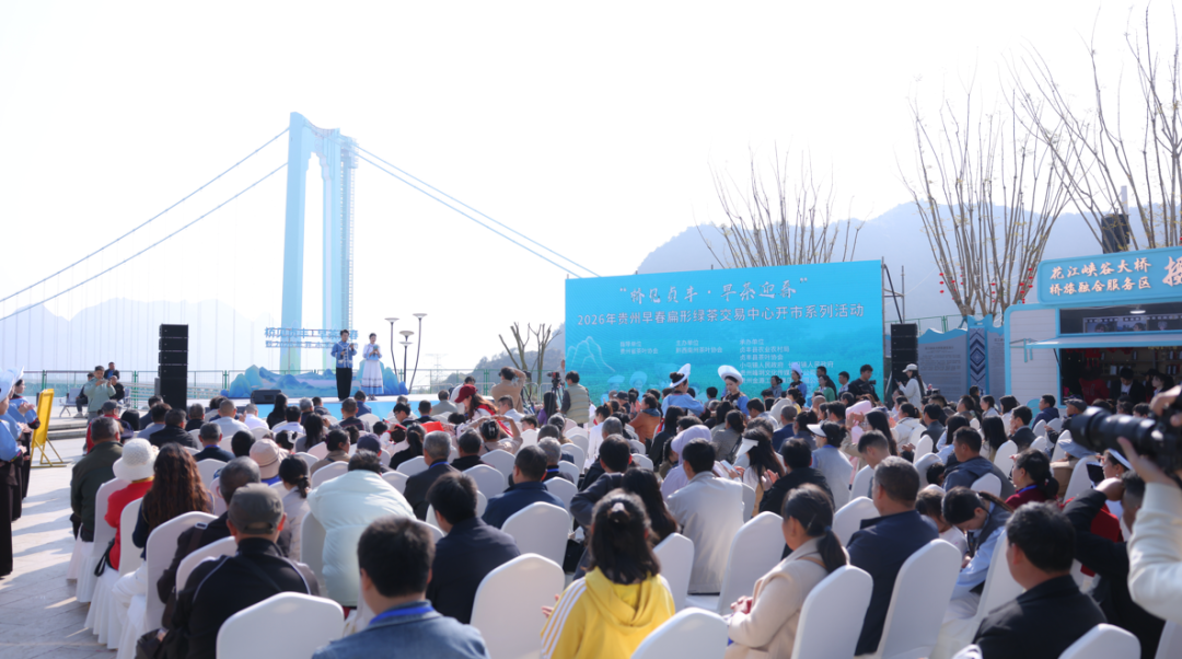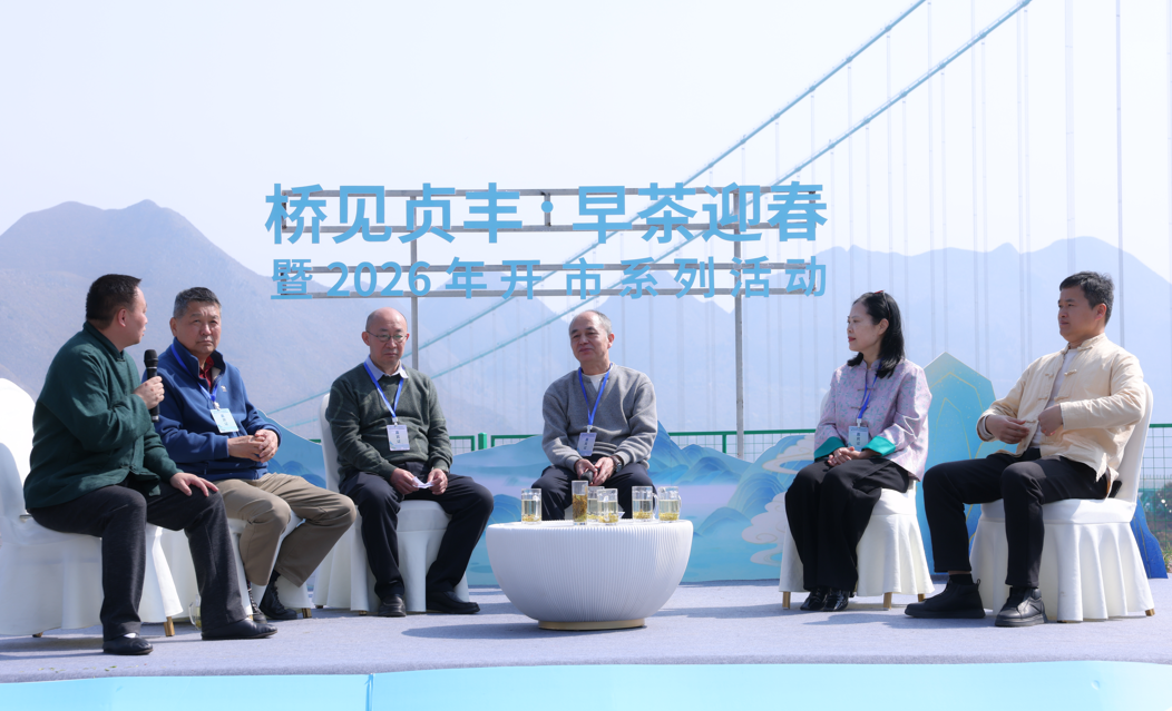 2月28日,“桥见贞丰·早茶迎春”2026年贵州早春扁形绿茶交易中心开市系列活动在花江峡谷大桥云渡服务区举行。贵州省茶叶协会副会长、黔西南州茶叶协会会长、黔西南州人大常委会原副主任(一级巡视员)黄健勇,贵州大学茶学院党委书记薛伟,县人大常委会原主任、贞丰县茶叶协会会长李正全及省、州、县茶叶协会相关负责人,贵州大学茶学院博士团队,相关茶企负责人和省内外茶商、桥梁专家、游客等参加。