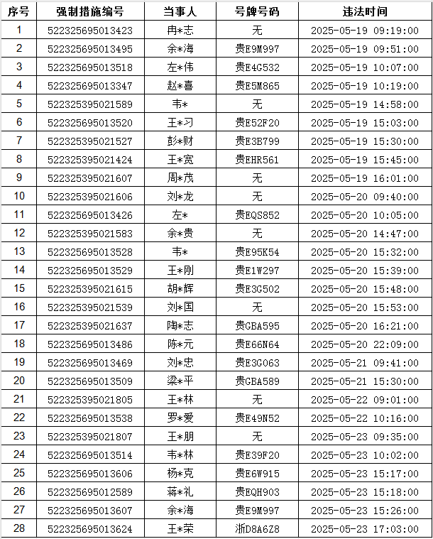 贞丰县公安局交通警察大队于2025年5月19日至2025年5月23日期间,在开展道路交通管理工作中共查获28名机动车驾驶人,根据法律法规的相关规定,贞丰县公安局交通警察大队执勤民警依法开具道路交通安全违法处理通知书或行政强制措施凭证扣留其驾驶的机动车或机动车驾驶证,以上机动车驾驶人并未在法律规定的时限内接受处理,现拟对你等28名机动车驾驶人依法作出行政处罚决定。