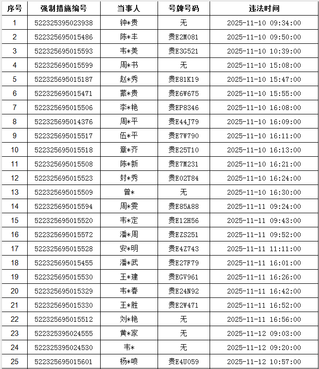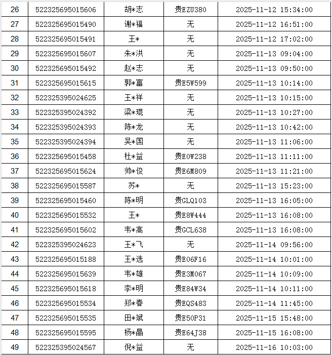 贞丰县公安局交通警察大队于2025年11月10日至2025年11月16日期间,在开展道路交通管理工作中共查获49名机动车驾驶人,根据法律法规的相关规定,贞丰县公安局交通警察大队执勤民警依法开具道路交通安全违法处理通知书或行政强制措施凭证扣留其驾驶的机动车或机动车驾驶证,以上机动车驾驶人并未在法律规定的时限内接受处理,现拟对你等49名机动车驾驶人依法作出行政处罚决定。