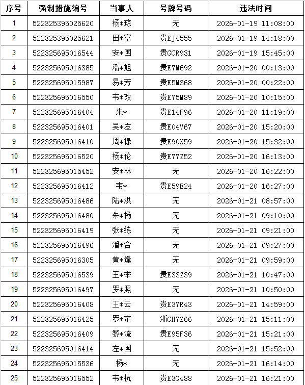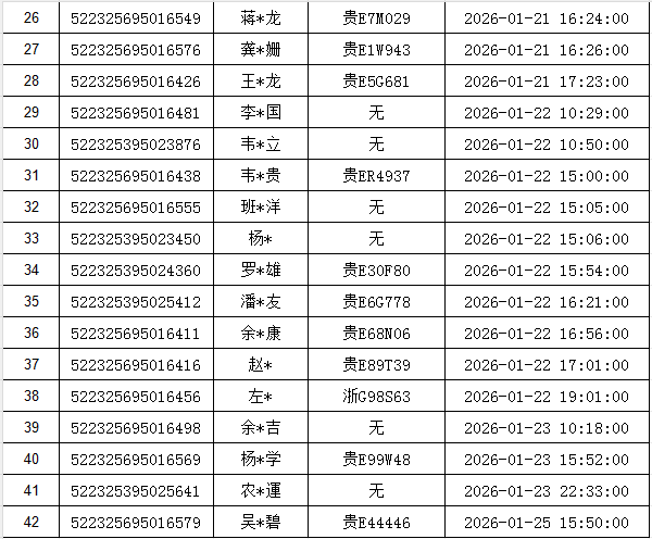 贞丰县公安局交通管理大队于2026年1月19日至2026年1月25日期间,在开展道路交通管理工作中共查获42名机动车驾驶人,根据法律法规的相关规定,贞丰县公安局交通管理大队执勤民警依法开具道路交通安全违法处理通知书或行政强制措施凭证扣留其驾驶的机动车或机动车驾驶证,以上机动车驾驶人并未在法律规定的时限内接受处理,现拟对你等42名机动车驾驶人依法作出行政处罚决定。