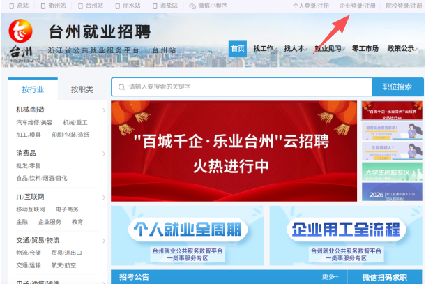 用人单位登录网站(https://0576.zjhr.com/),点击“企业登录/注册”,输入浙江政务服务网用户名和密码(或新注册政务服务网法人账号),即可登录系统。首次登录需先完善资料,审核通过后即可进入用户中心,发布招聘岗位。