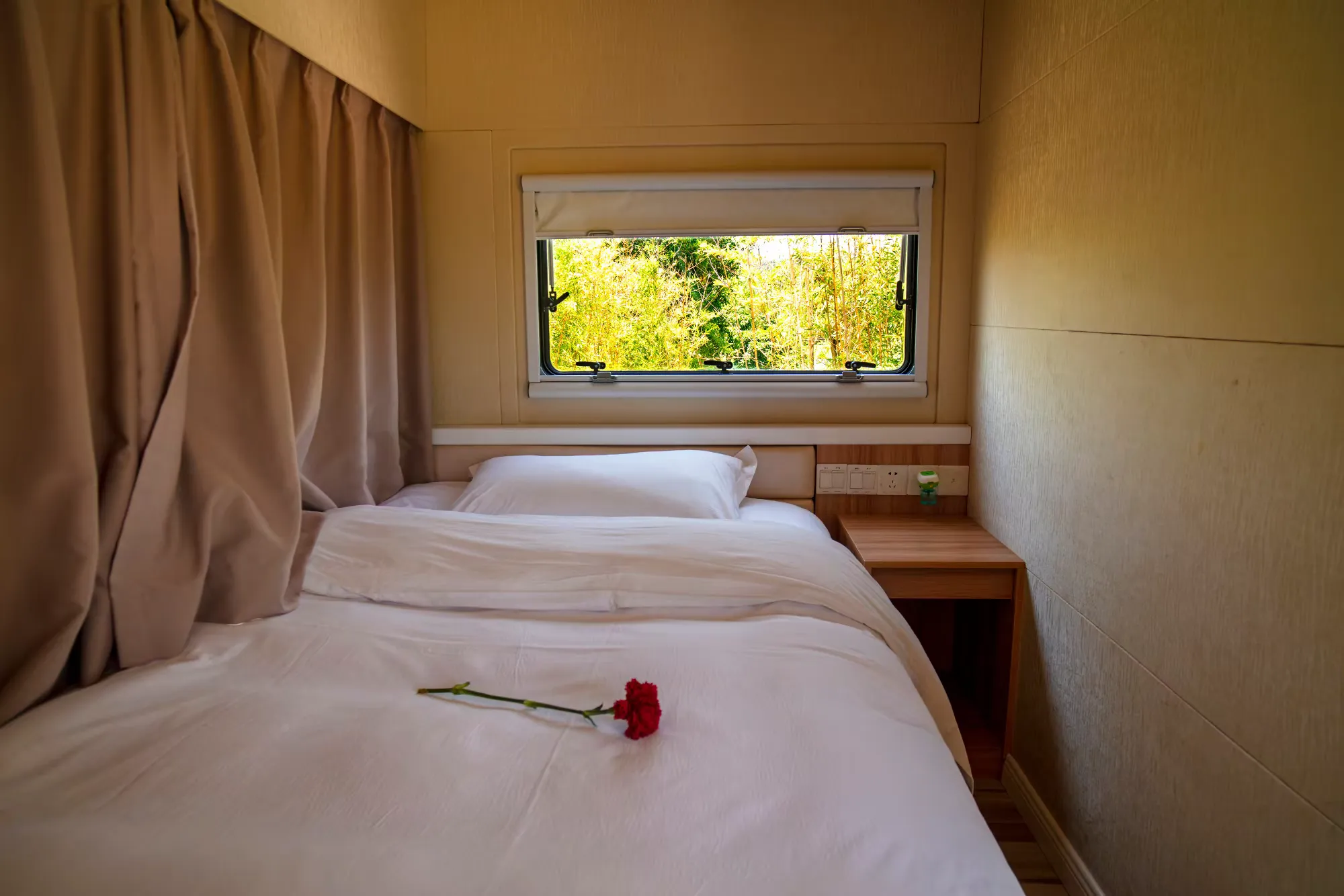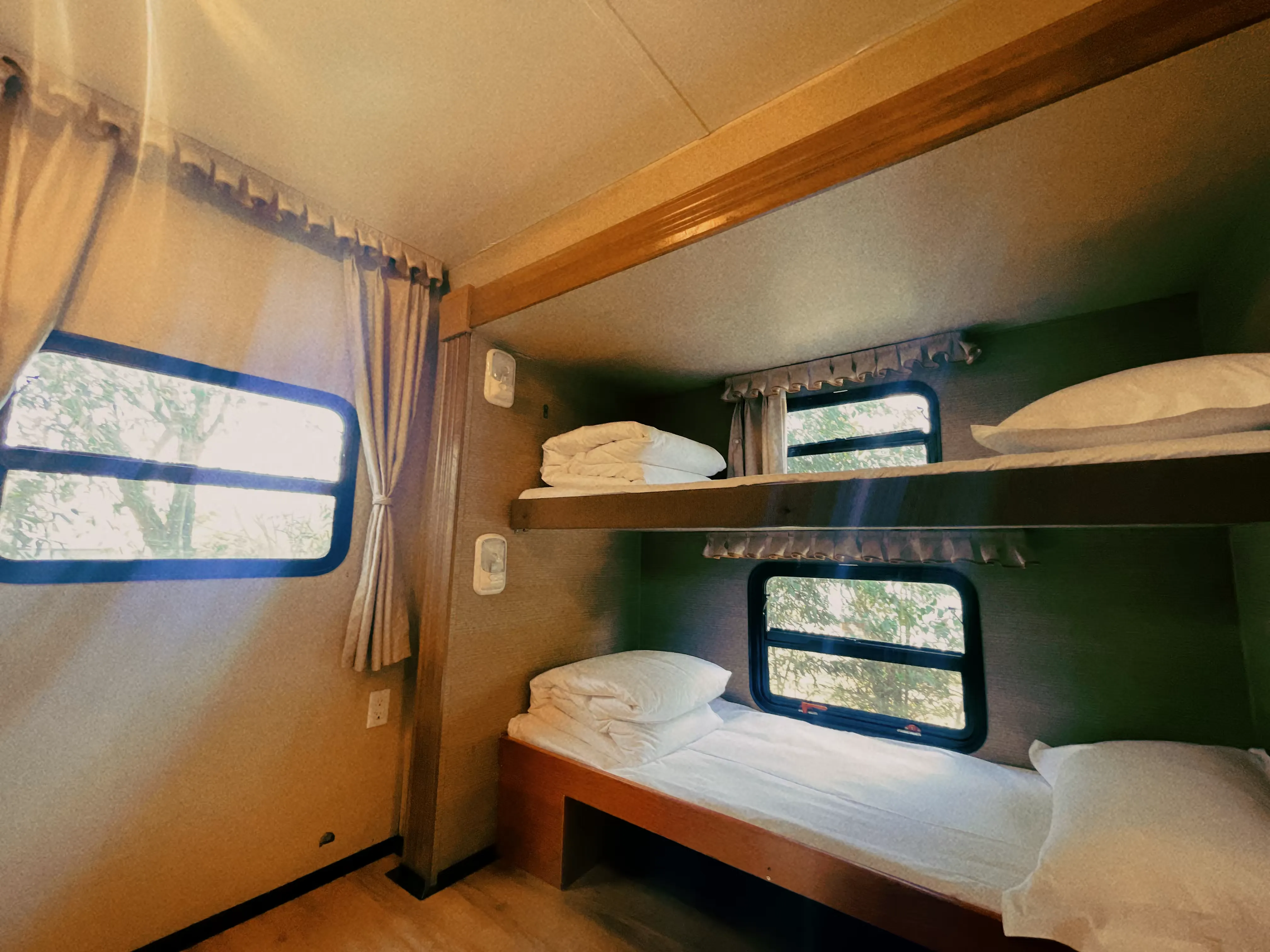 家庭房车有两个卧室,类似火车高低铺的多床位,可入住5-6人,配套设施齐全,是家庭露营的新体验方式。
