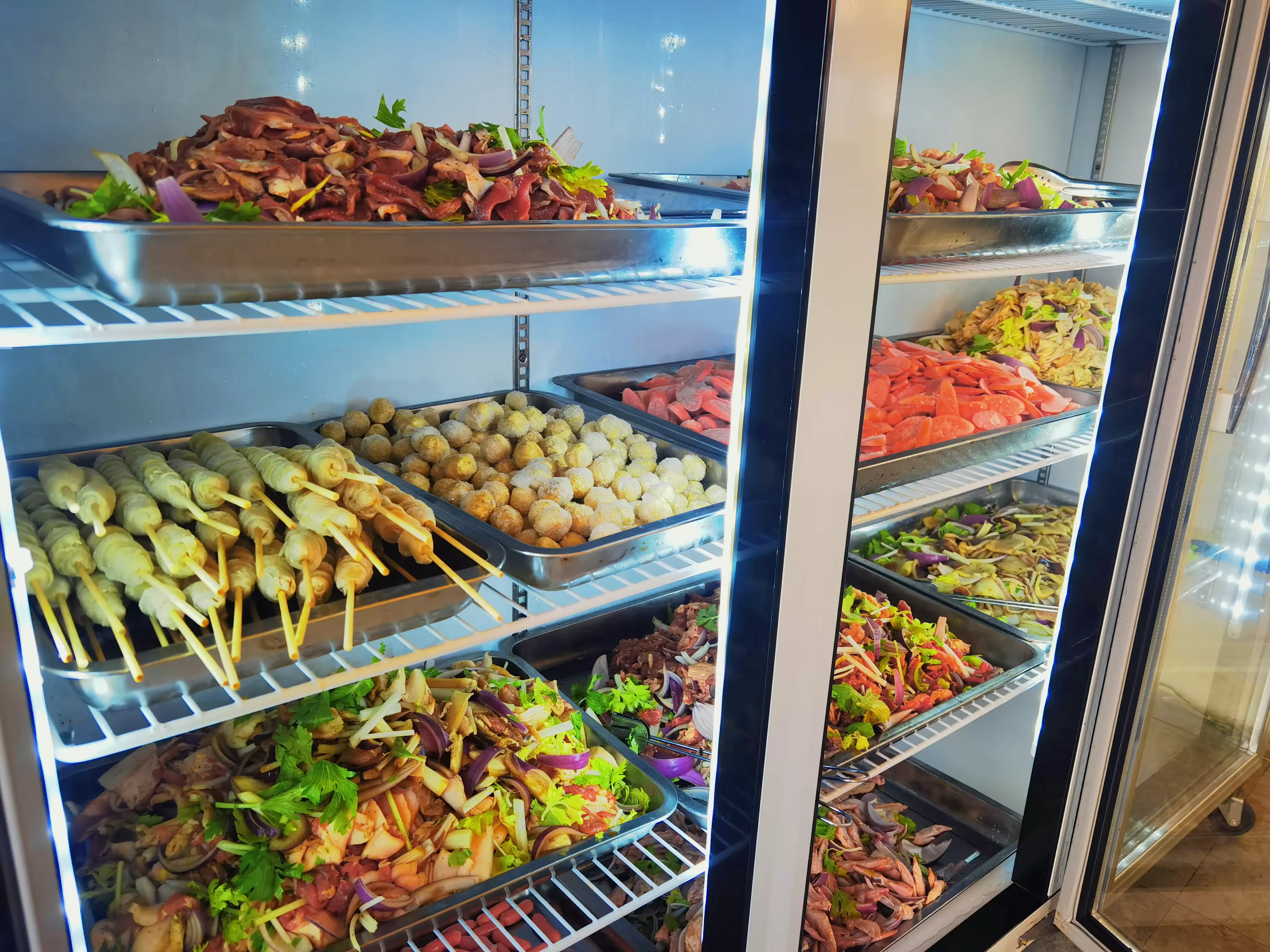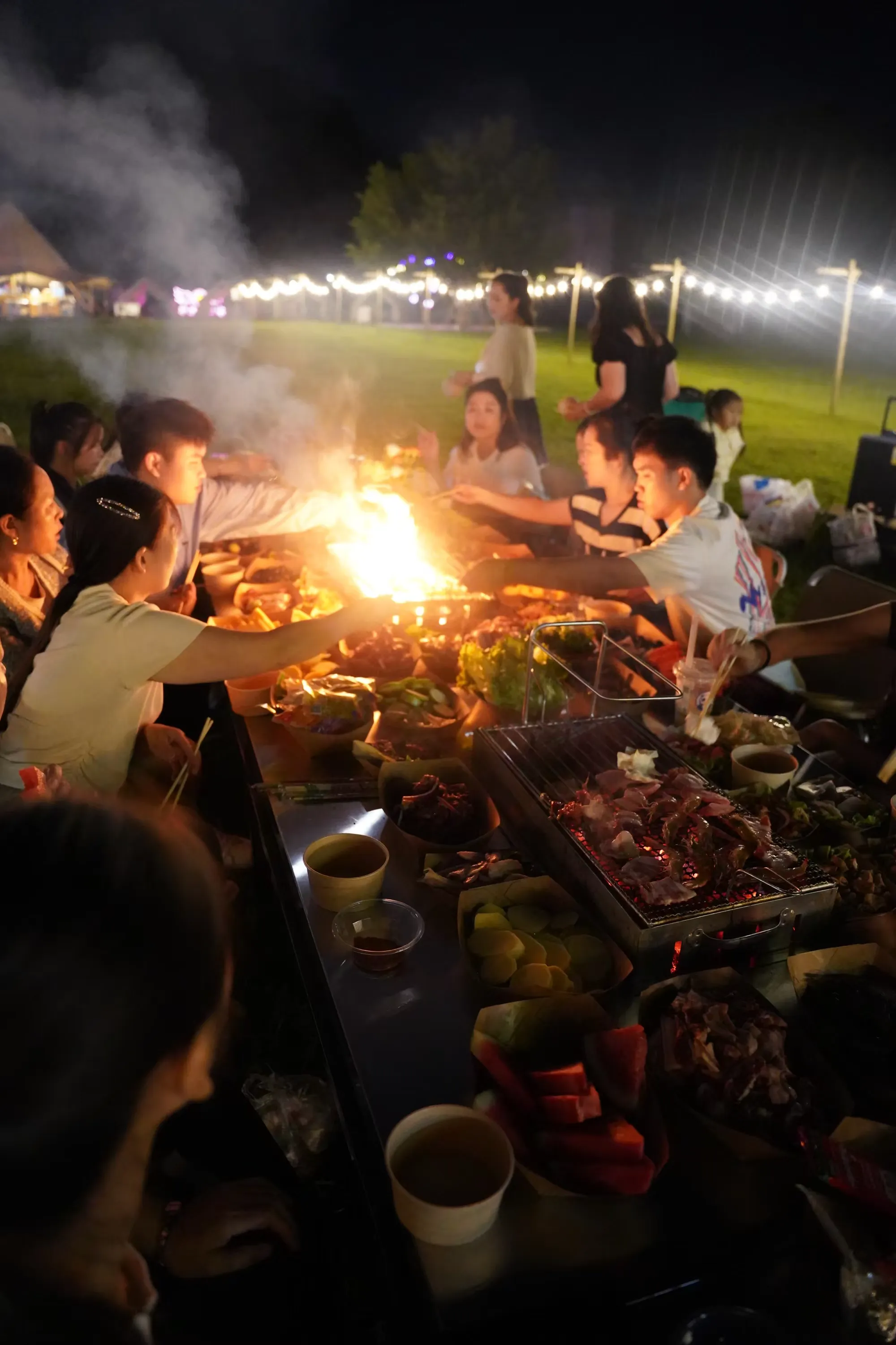 烧烤区共有14个亭子,每个亭子可容纳约13-15人同时烧烤,菜品种类有三十多种,荤素搭配、食材干净新鲜,烧烤区配有特色烤全羊、手打糯米糍粑等,是露营烧烤、公司团建、家庭聚餐、朋友聚餐的不二首选。