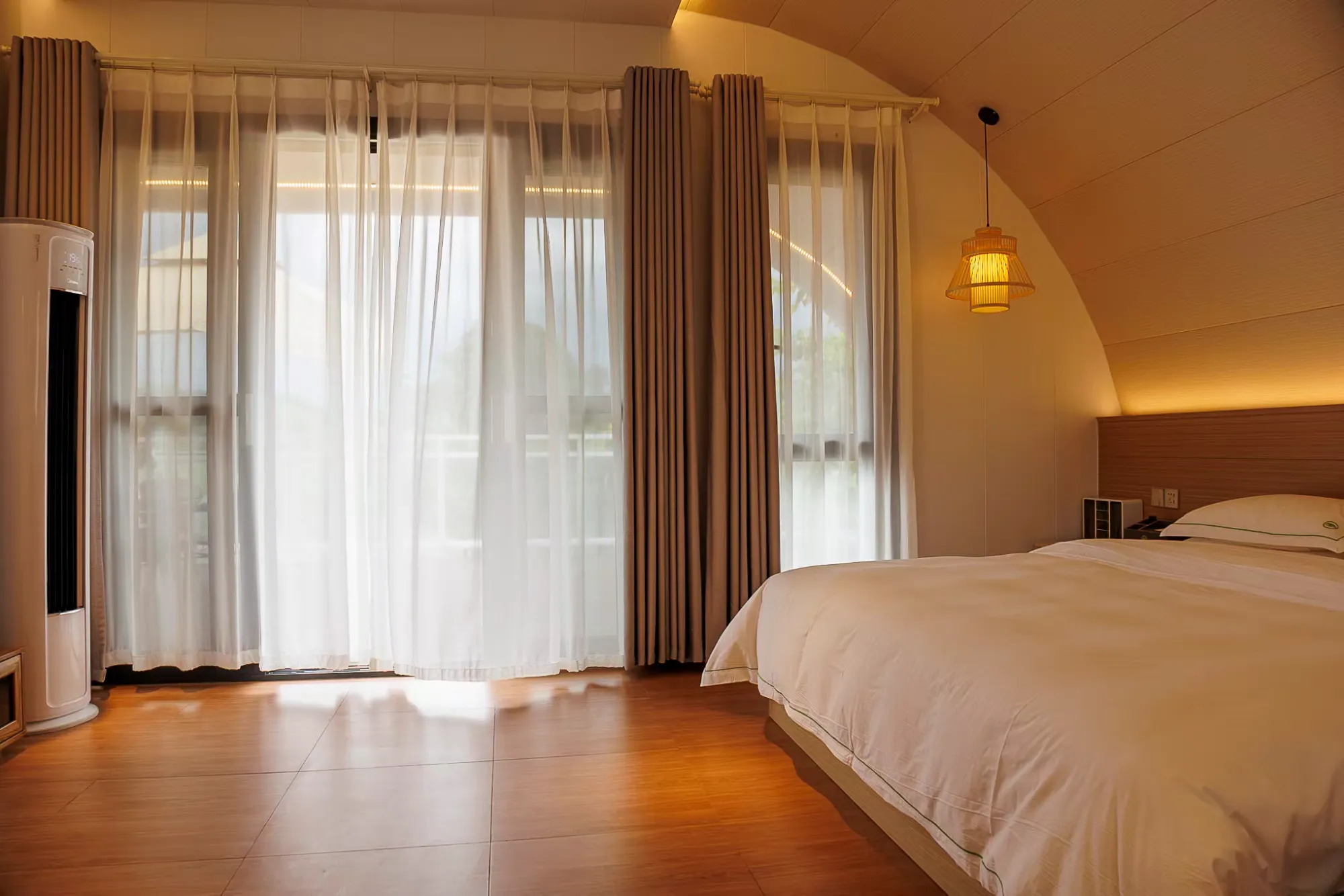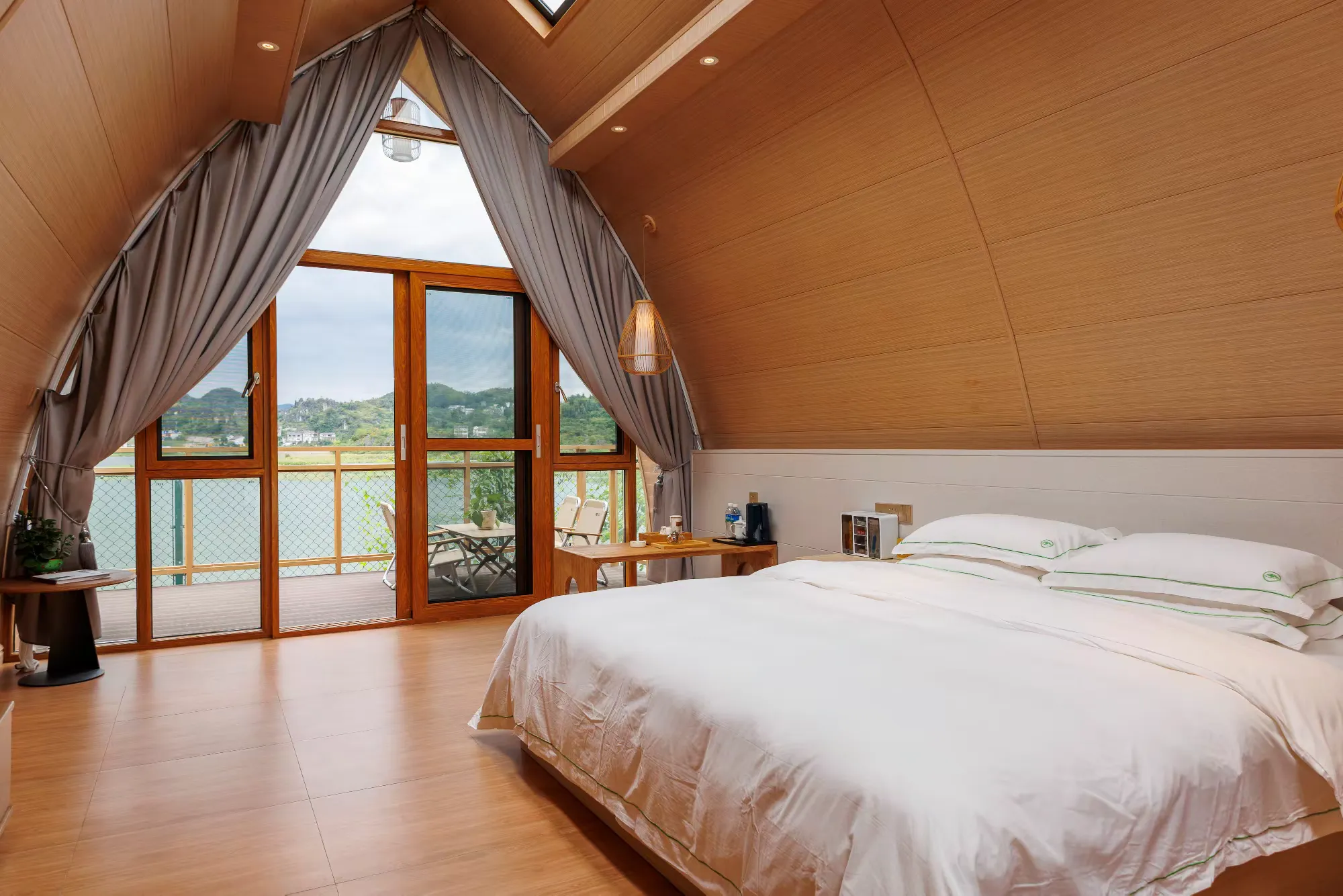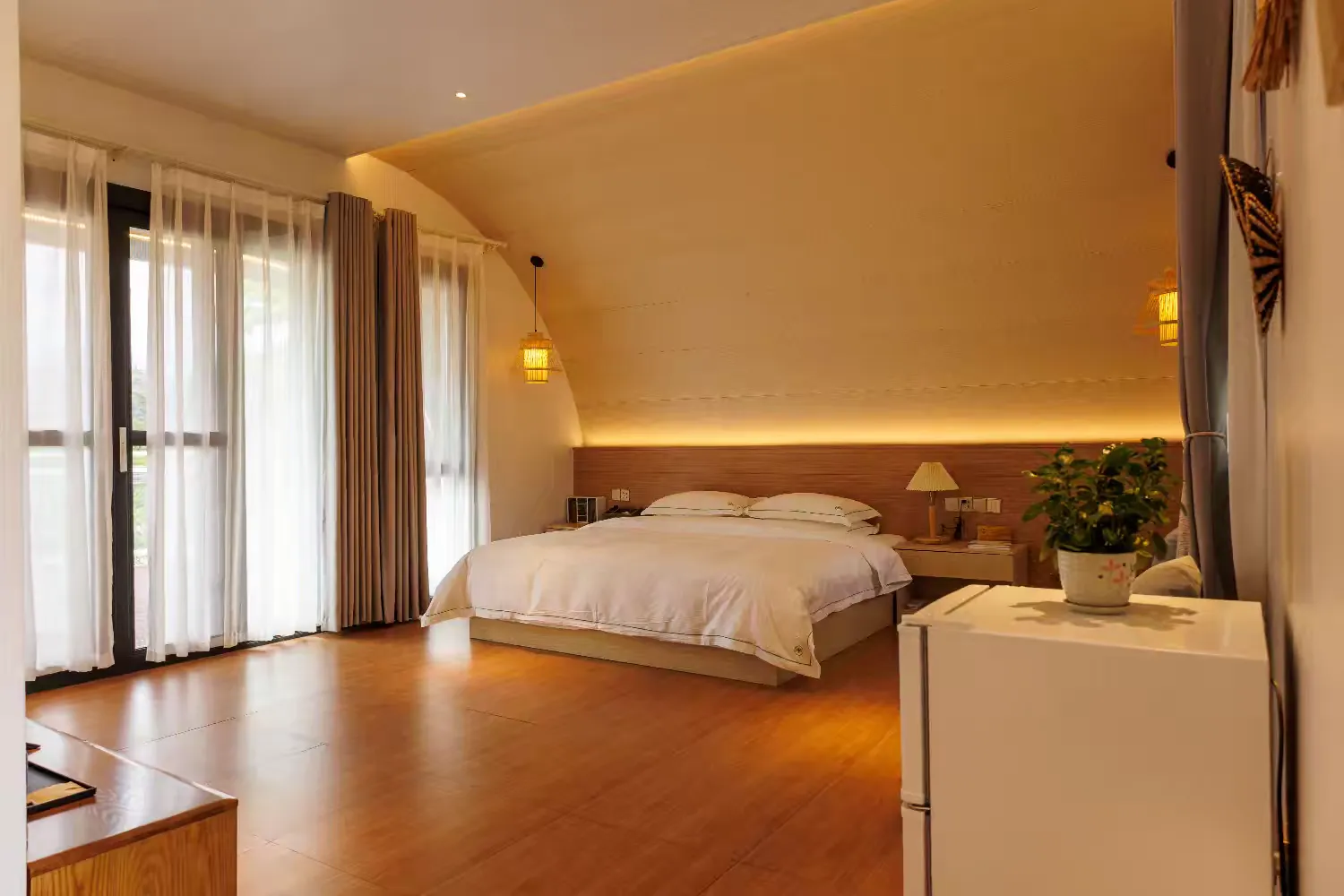 雅居群落景观大床房宽敞明亮,精致的家具让人倍感温馨舒适,尽情享受轻奢度假氛围。
