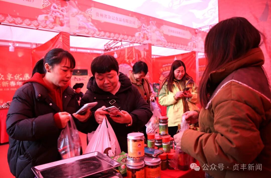 “贞丰县2025年“乐购年货·畅游金县”年货展销会,邀请了县内、外企业和商家共计60家参展,集中展示销售特色农特商品、工贸产品、金融房产等,产品多达150余种,最高优惠到5折,真正让群众一站式享优惠、购年货。”贞丰县工科局副局长王显江说。