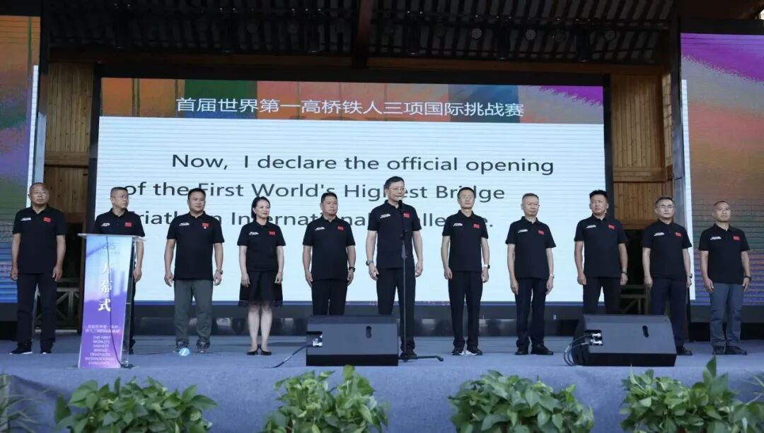贵州省体育局党委书记、局长马雷宣布首届世界第一高桥铁人三项国际挑战赛开幕。黔西南州政府副州长代乐,黔西南州政协副主席、贞丰县委书记段棚,贵州交投集团党委副书记、董事、工会主席周建华,贵州省体育局二级巡视员朱俊华,贵州省交通运输工会副主席张胜顶,贵州旅投集团体育研学公司总经理王开青,黔西南州文化体育广电旅游局局长王文波,贞丰县委副书记、县长李祖平,贞丰县人大常委会主任蒙立胜,中国铁人三项协会理事岑永枫出席。