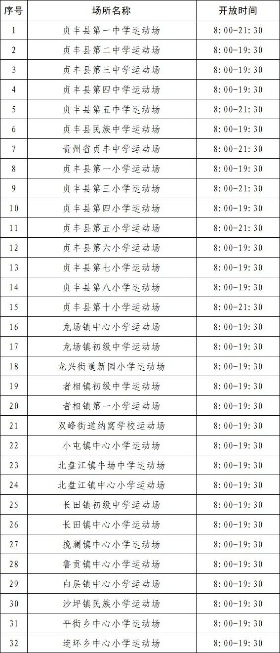 贞丰县2026年寒假期间学校体育场所开放时间汇总表